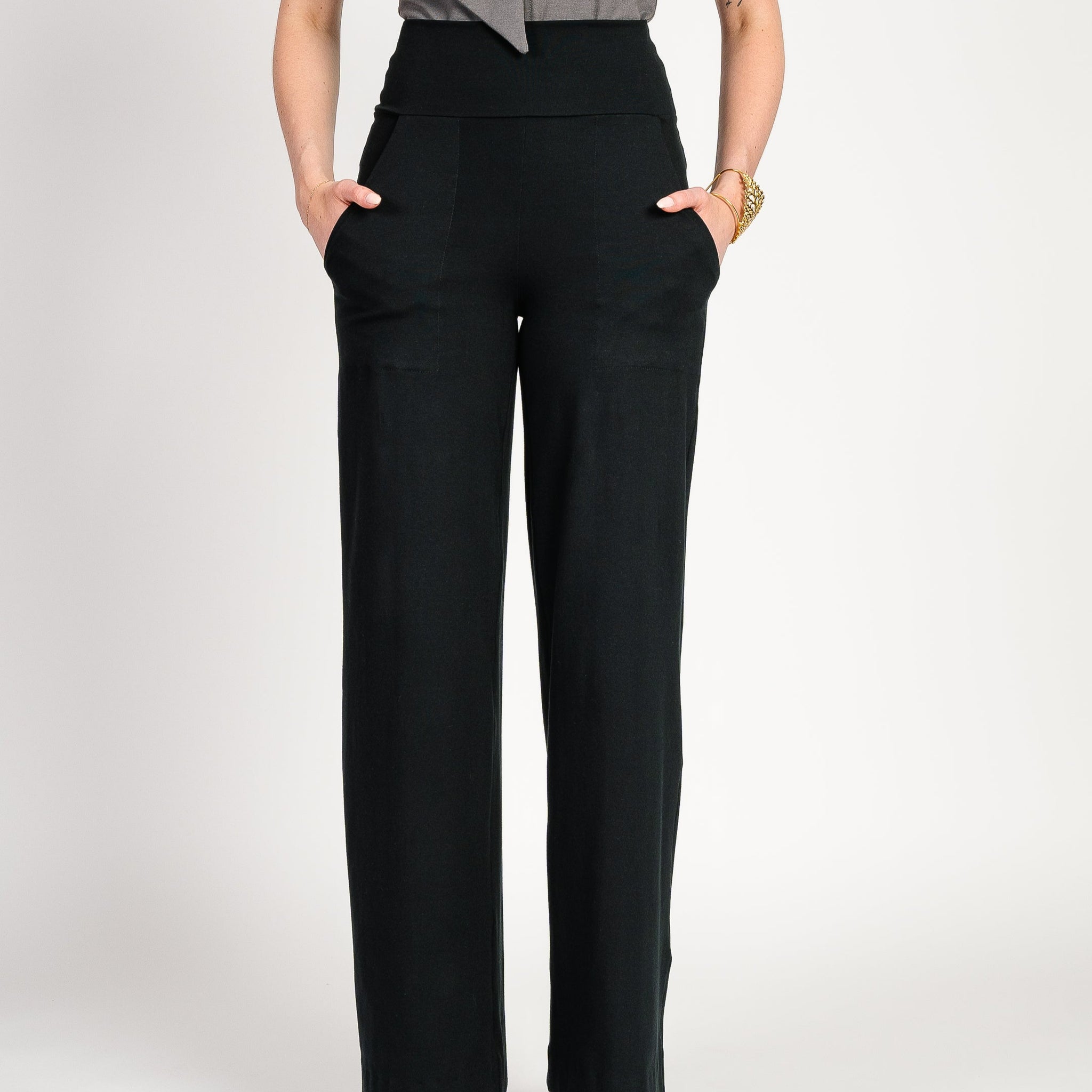High waisted wide leg trouser made with heavy weight organic cotton and spandex jersey. These trousers are well fitted at the waist and hip and then gradually widening down to the hem. They come in a 32" inseam with an extra 2" hem for extra length if needed. Can be special ordered with your particular inseam provided. These pants are simple and super elegant and comfortable and will feel like a closet staple since they are so easy to wear and care for. Another design that can be dressed up with a heel or worn casually with flats. Made of organic cotton fabric that is certified to be sustainably grown and free of toxic dyes and finishes. Made in small batches in Massachusetts this is fashion that is ethical and sustainable but also elegant and timeless.