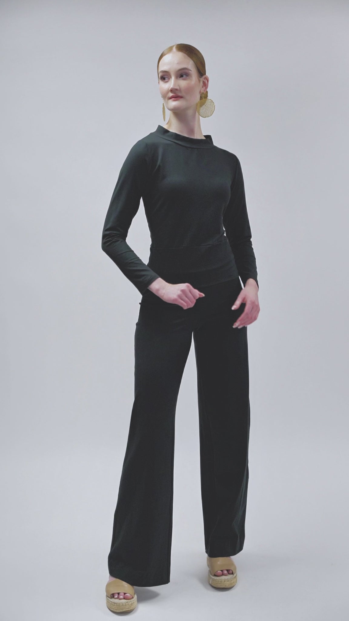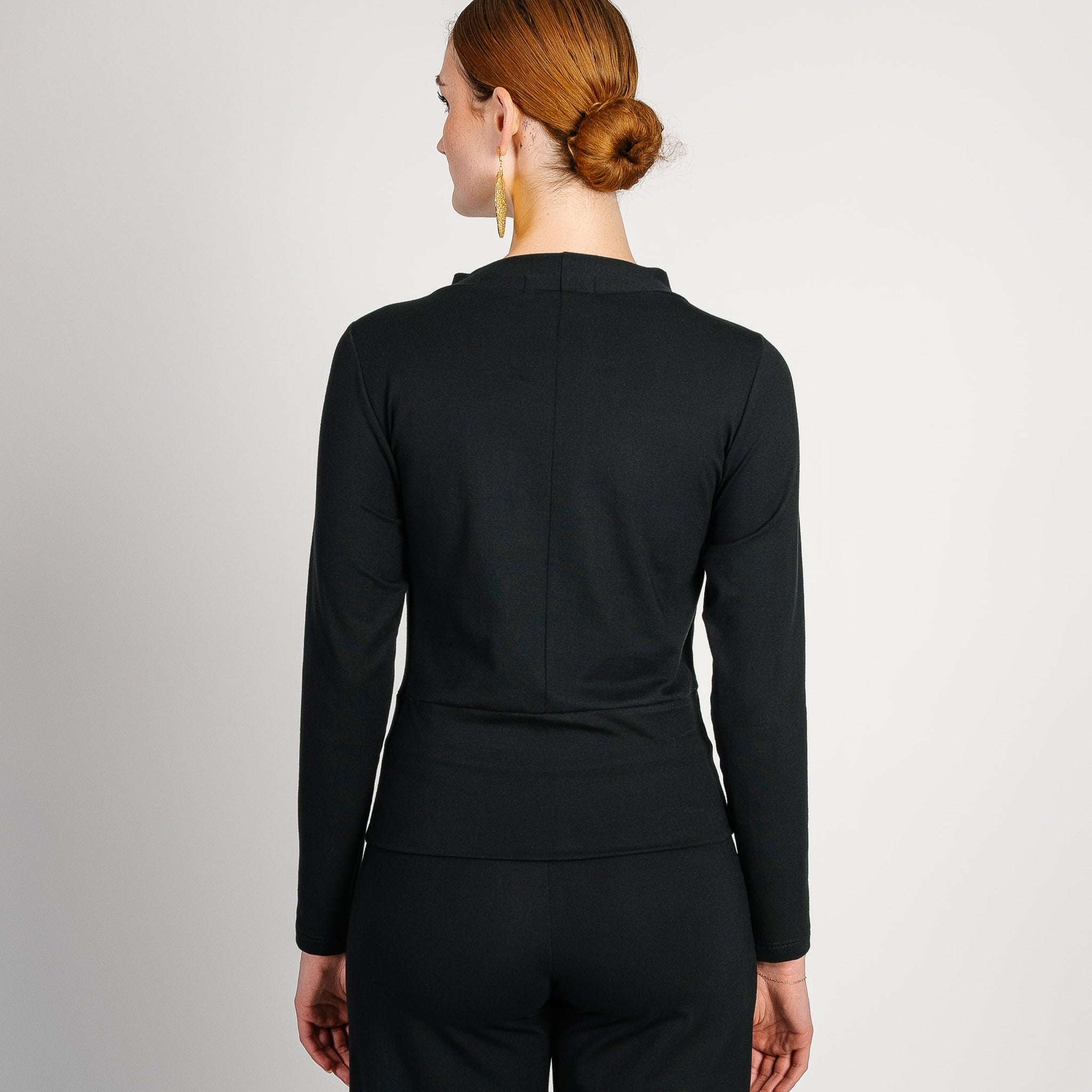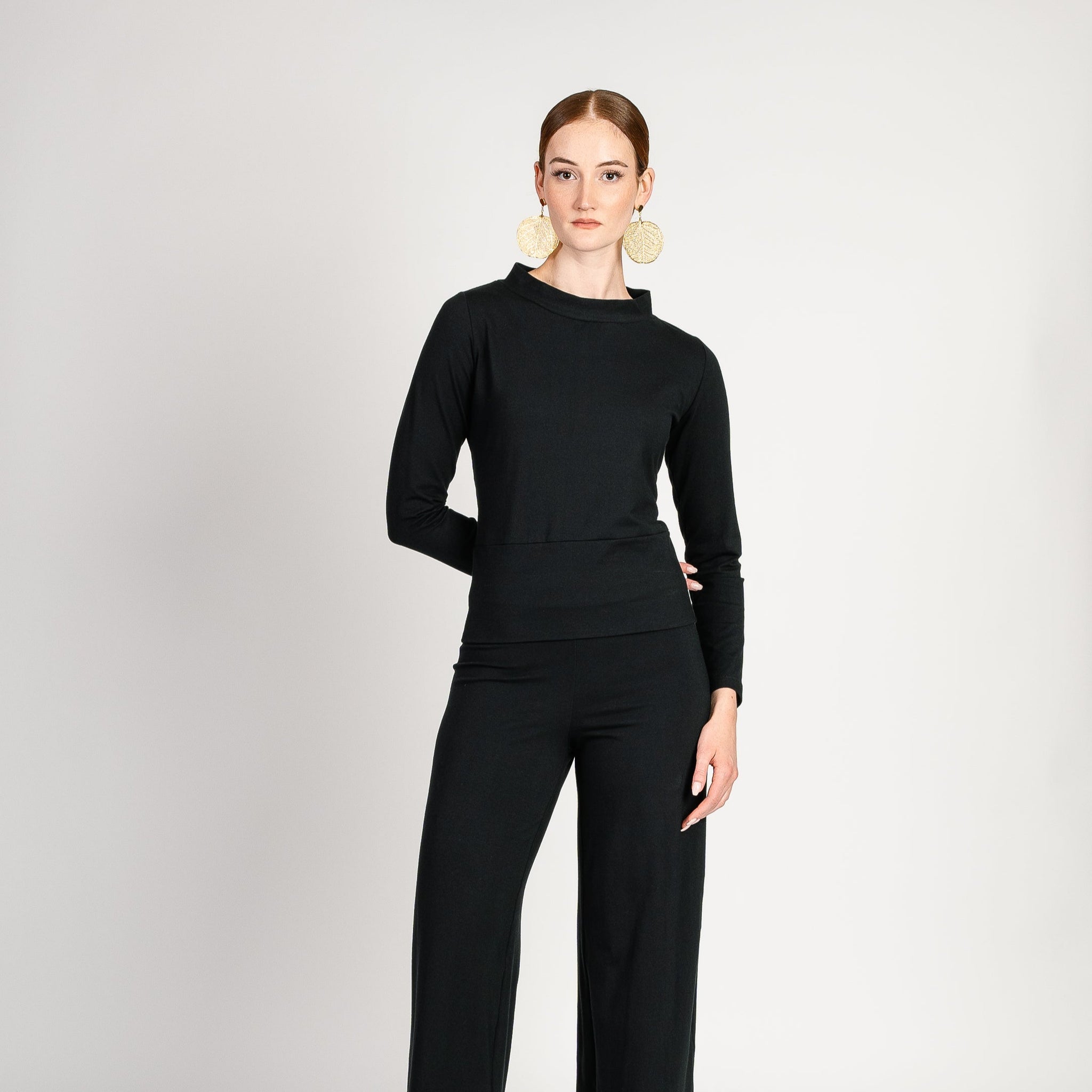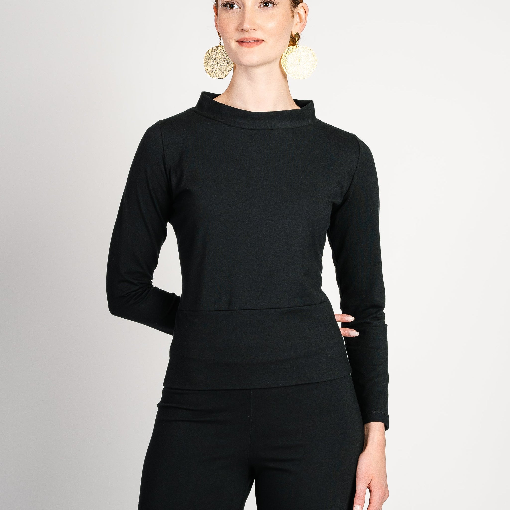 Black long sleeve blouse with a unique wide open stand up collar and a reinforced wide waistband for extra cinching. This design is made with organic cotton and spandex heavy weight jersey that gives it nice structure and the look of quiet luxury. It is a great closet staple as it is simple and elegant and can be worn with skirts, trousers, under suit jackets or simply with jeans. Works great as a layering piece or as a simple clean canvas to display your statement Carla Shaw jewelry. A great piece for travelling as it is easy to care for and has minimal wrinkling. Made of organic cotton fabric that is certified to be sustainably grown and free of toxic dyes and finishes. Made in small batches in Massachusetts this is fashion that is ethical and sustainable but also elegant and timeless.