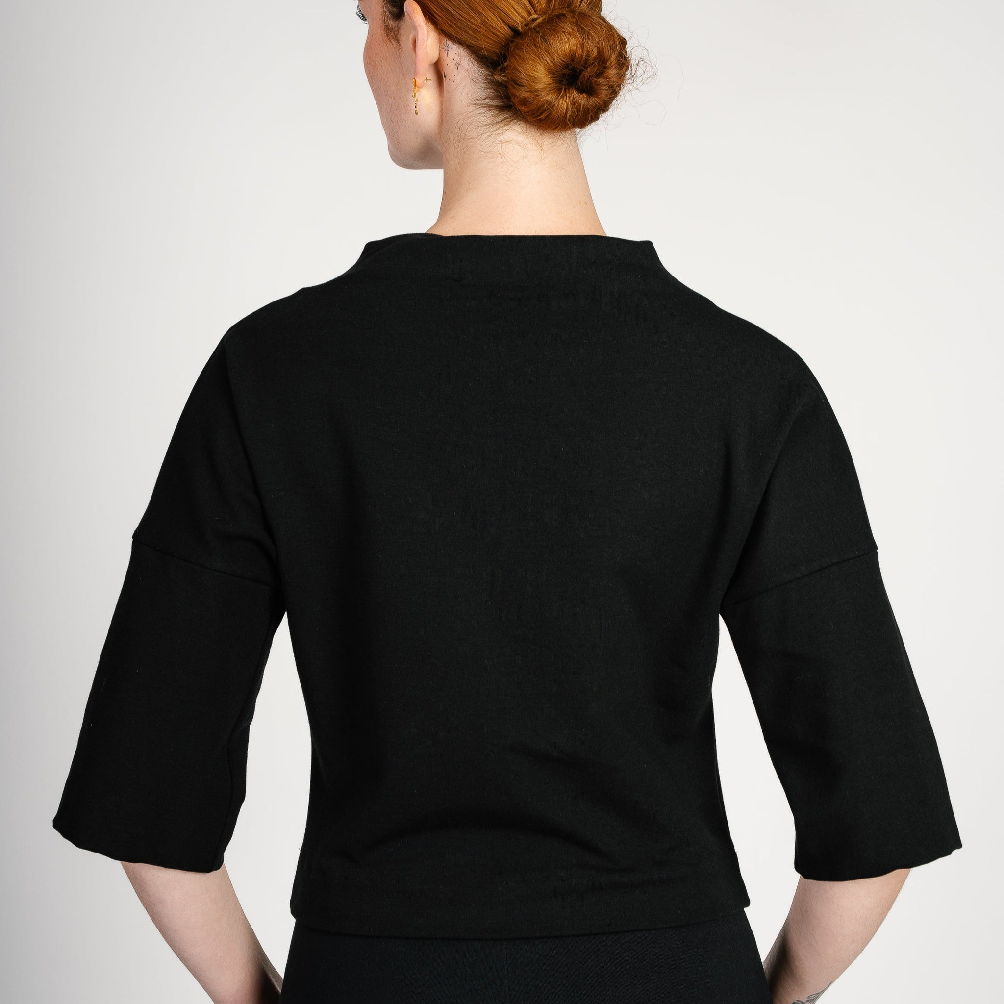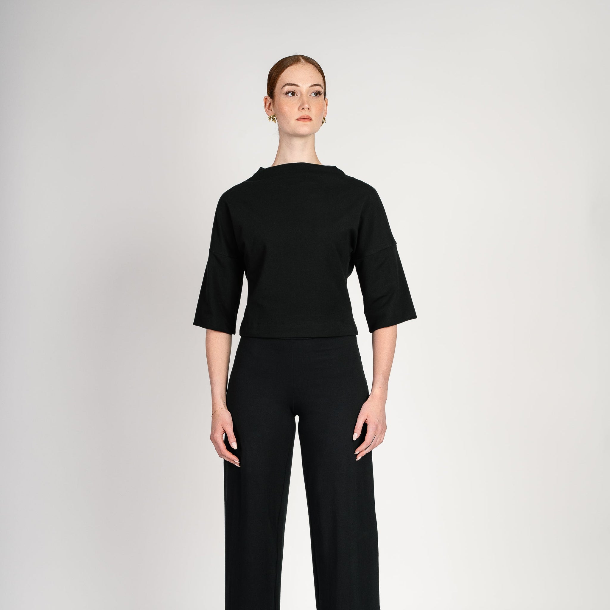 Black long sleeve blouse with a relaxed collar and slightly cropped top. This design is made with organic cotton and spandex heavy weight jersey that gives it nice structure and the look of quiet luxury. It is a great closet staple as it is simple and elegant and can be worn with skirts, trousers, under suit jackets or simply with jeans. Works great as a layering piece or as a simple clean canvas to display your statement Carla Shaw jewelry. A great piece for travelling as it is easy to care for and has minimal wrinkling. Made of organic cotton fabric that is certified to be sustainably grown and free of toxic dyes and finishes. Made in small batches in Massachusetts this is fashion that is ethical and sustainable but also elegant and timeless.