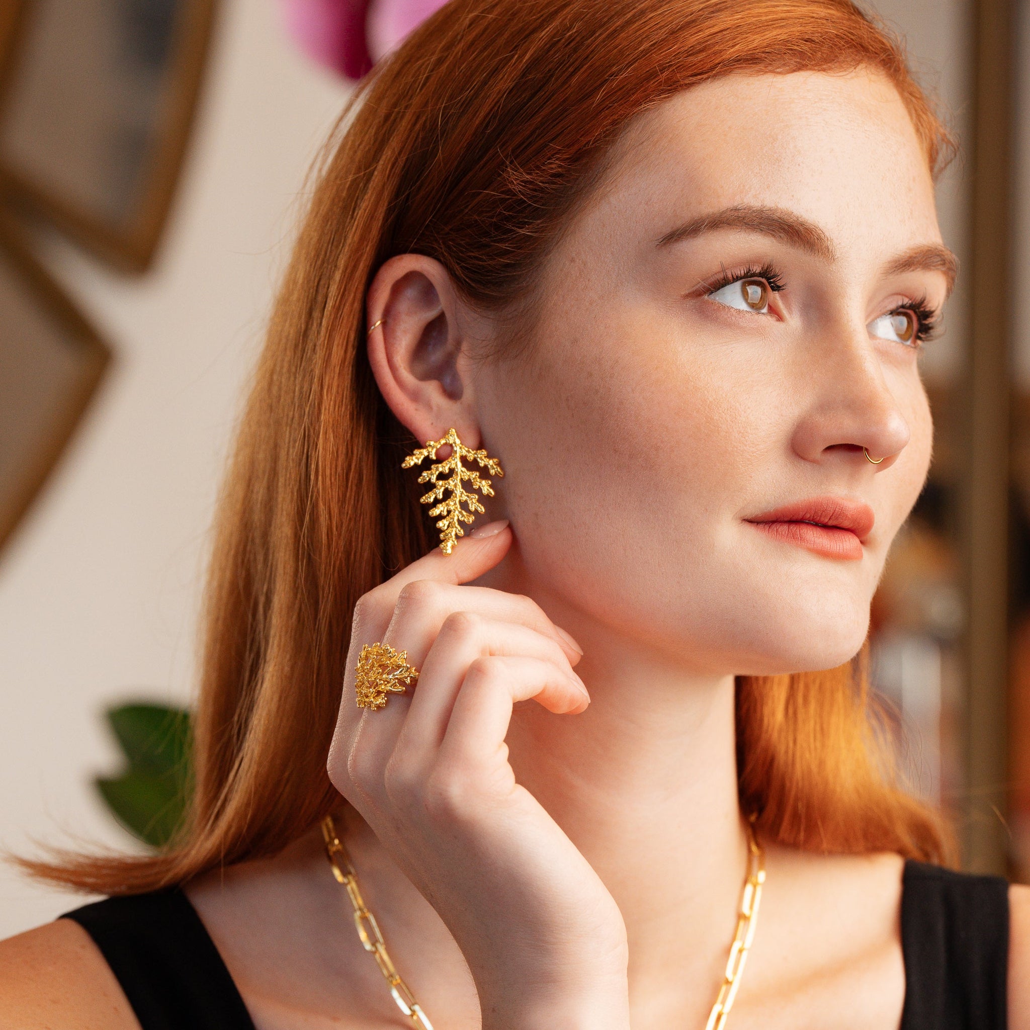 • Load image into Gallery viewer, Cypress earrings gold sustainable jewelry leaf